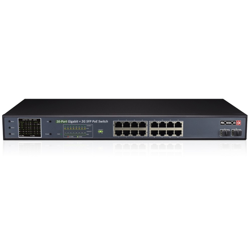 - Portkiosztás: 16 x 10/100/1000 Mbps RJ45 PoE port + 2 x 1 Gbps SFP port